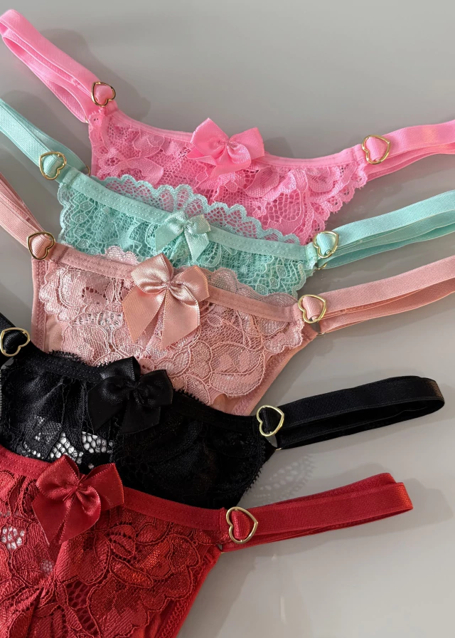 Renda antialérgica, forrada em algodão na frente e fundo, regulagem em coração banhado a ouro 24k ✨